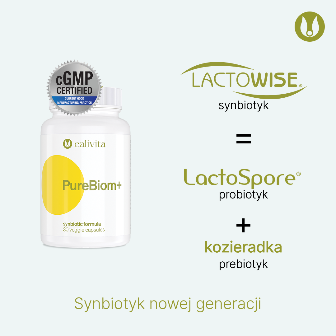 PureBiom+ to synbiotyk - mieszanka składników zastrzeżona pod nazwą LactoWise®:
