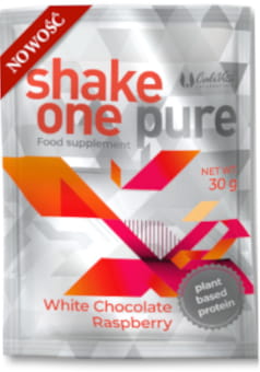 Odżywka białkowo-węglowodanowa o smaku białej czekolady i malin łatwo rozpuszczalna w wodzie, napoju roślinnym, wzbogacona w witaminy, składniki mineralne, inulinę z korzenia cykorii, ekstrakt z jagód acai, enzymy: papainę, bromelainę, będące wsparciem dla osób na diecie redukcyjnej i budującej fit sylwetkę. Koktajl białkowo-węglowodanowy Shake One Pure pomaga zrzucić zbędne kilogramy, wyrzeźbić sylwetkę, zapobiegać utracie masy mięśniowej podczas stosowania diety, zaspokajać ochotę na słodycze oraz wspiera regenerację mięśni po treningu. To doskonale zbilansowane źródło białka pochodzenia roślinnego zarówno dla wegetarian, jak i osób spożywających mięso.